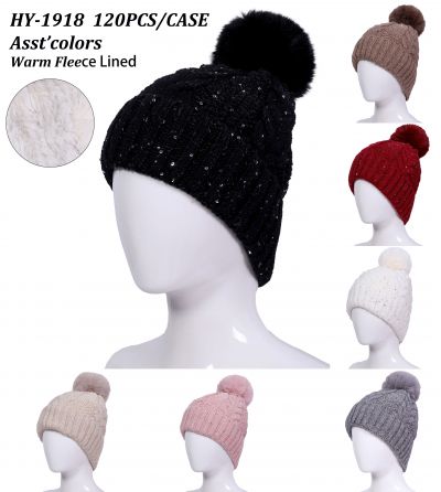 Women's Winter Knitted Pom Pom Beanie Hat with Faux Fur One Dozen Wholesale Assorted Colors